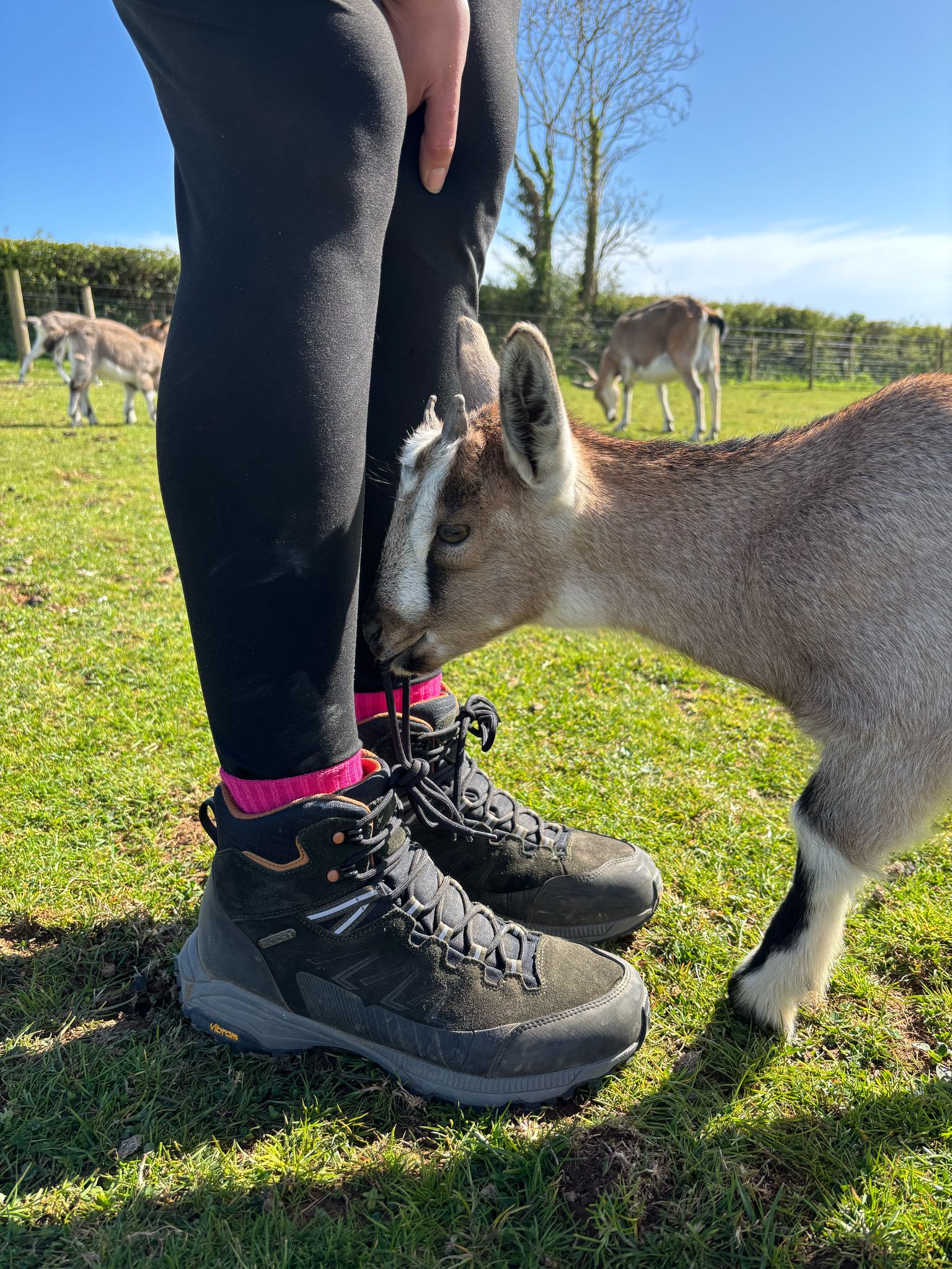 Buddy is a Wethered goat (that means he’s been castrated) and lives happily with the female goats and their kids, rather than with the boys, Geronimo and Goliath. He’s more like a dog than a goat, and he loves following people around, trying to nibble wellies, and soaking up attention.
